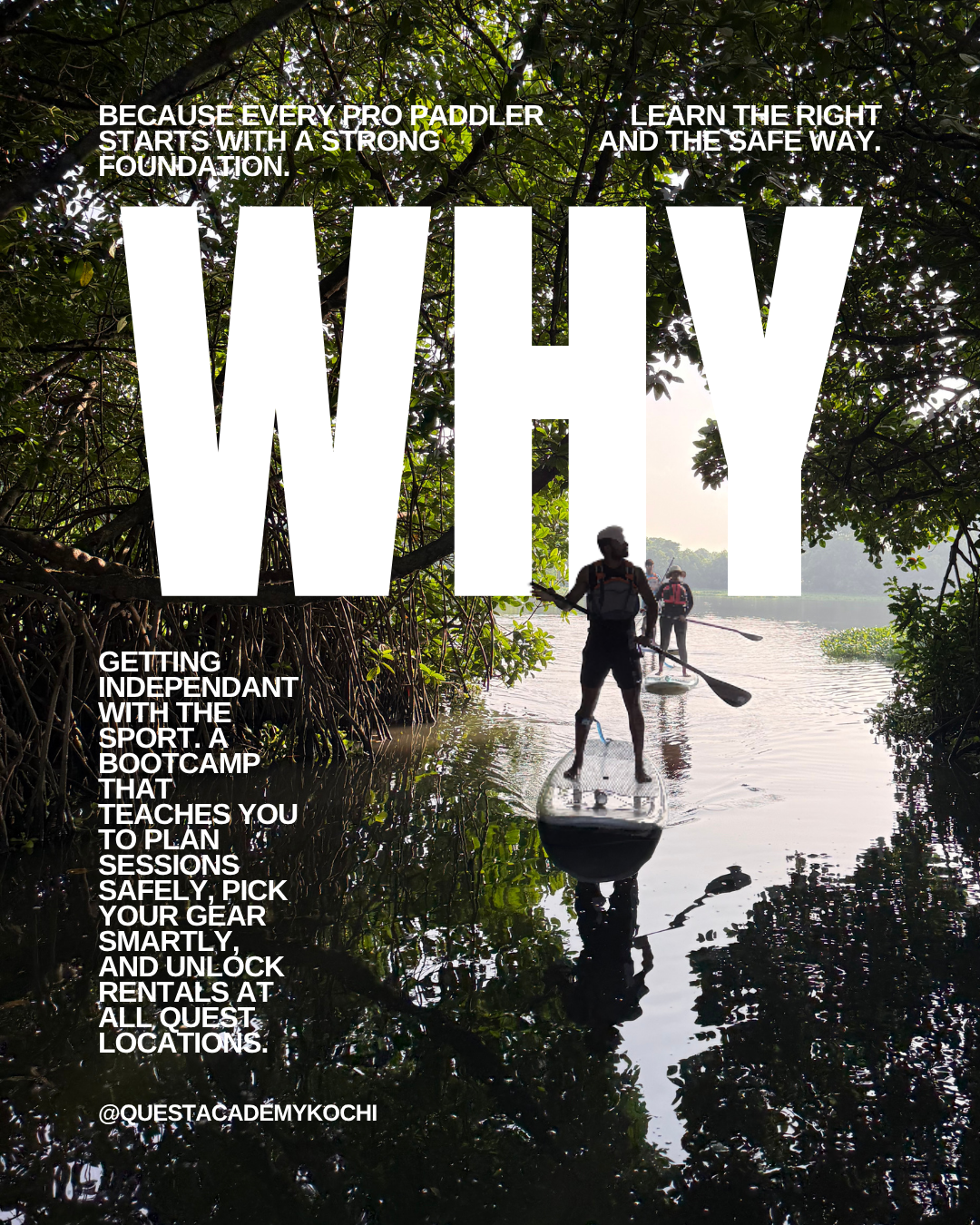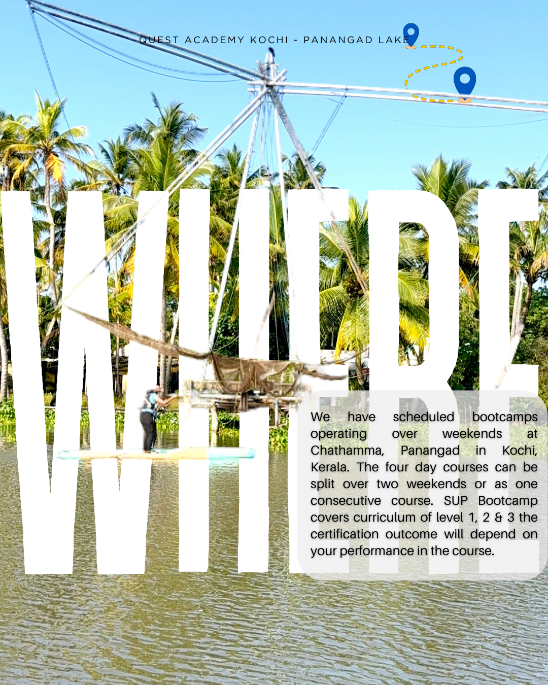 Quest Academy Kochi is based on the calm backwaters, with direct access to sheltered waterways and mangrove channels. The location is ideal for learning SUP and developing confidence through guided sessions, exploration routes, and skill-building practice.