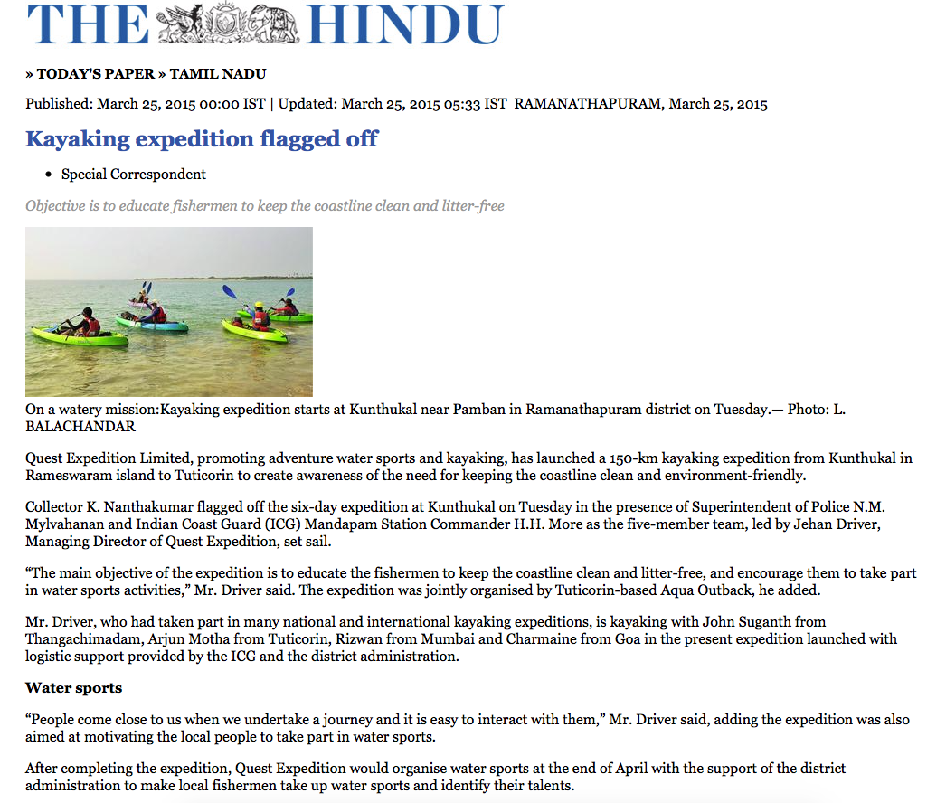Kayaking Expeditions from Rameswaram to Tuticorin on 25th March 2015